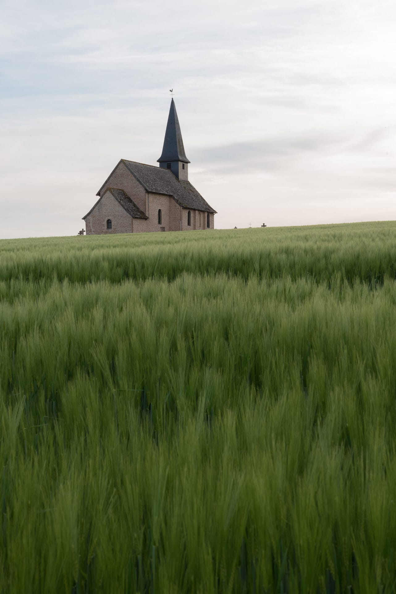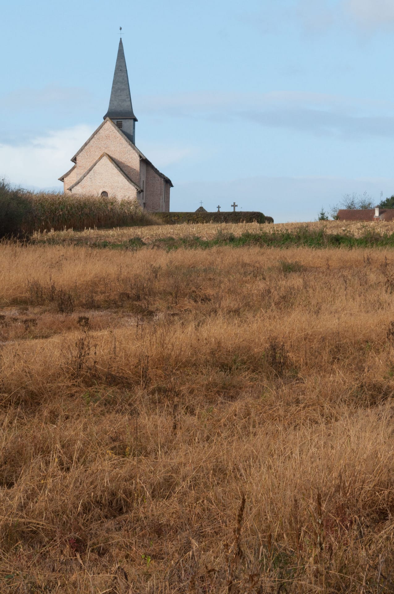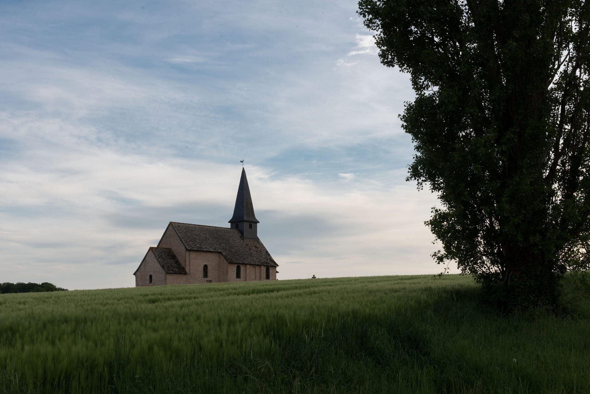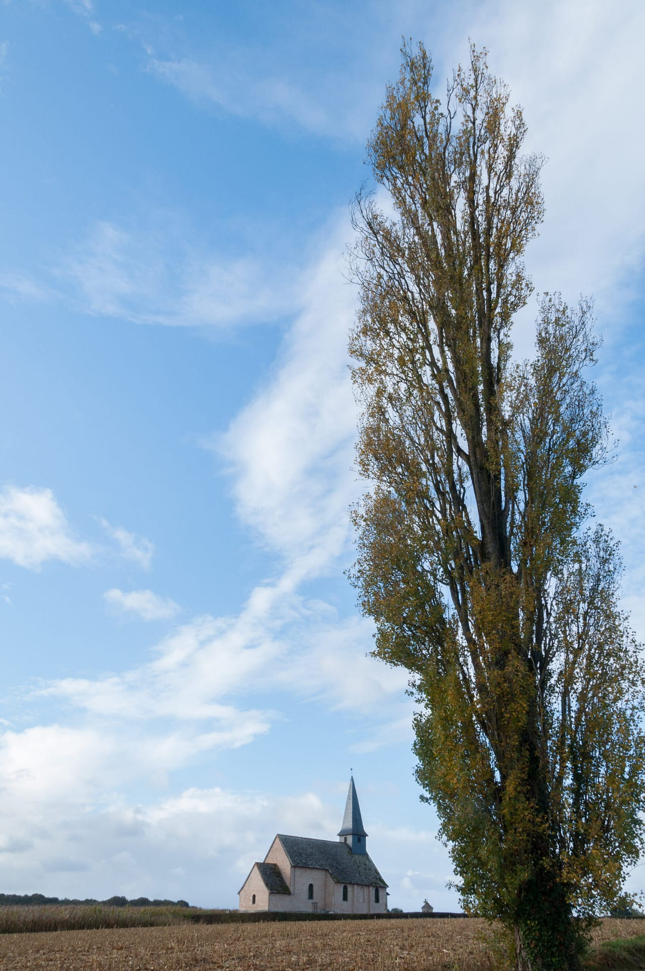 Bien sûr l’élément fort du tableau c’est Christina mais le décor, sobre et inhabituel, participe à la création d’une atmosphère étrange et légèrement angoissante avec une bâtisse, au loin, au sommet d’une colline et une terre agricole, vide, en avant plan. C’est ce décor inaccoutumé que j’ai reconnu, ce champ en pente douce et le bâtiment isolé, l’église, au loin. Une émotion est née, j’ai repensé au “monde de Christina” et j’ai tenté avec la photo de retrouver cette atmosphère si particulière. Je retourne de temps à autre dans ce lieu reculé pour ressentir la poésie du paysage.